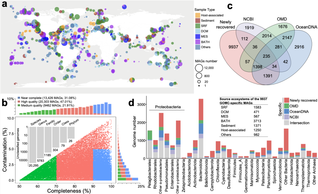 研究团队历时五年,通过对目前已公开的接近240Tb海洋微生物宏基因组数据进行重分析,构建了拥有超4.31万个海洋微生物基因组和24.58亿个基因序列的海洋微生物组数据库The Global Ocean Microbiome Catalogue(GOMC),包含从南极到北极、从近海到深远海、从表层海洋到万米超深渊等多样化的海洋生态系统。