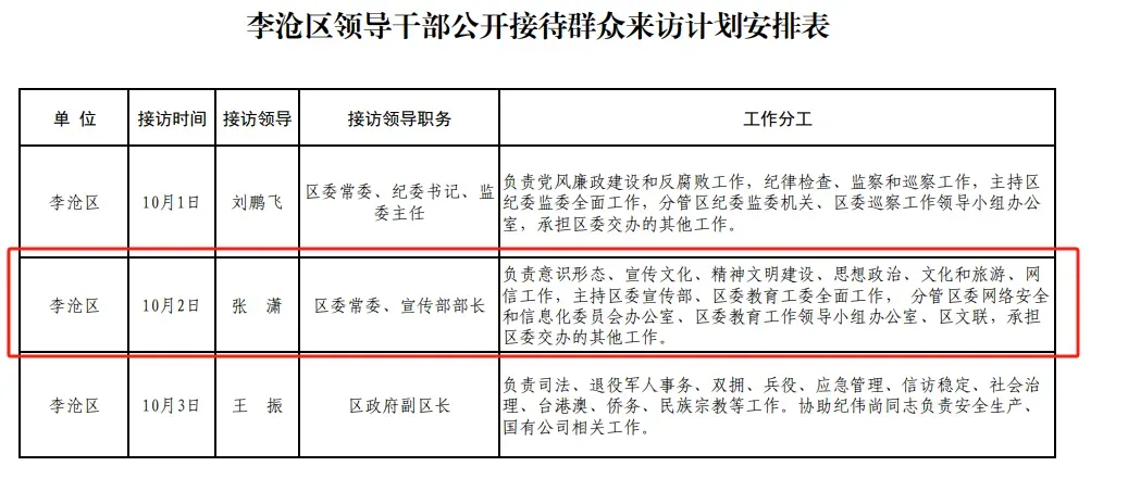 及至此番区领导公开接访计划的公布,也正式明确了张潇李沧区委常委、宣传部部长的新职务。