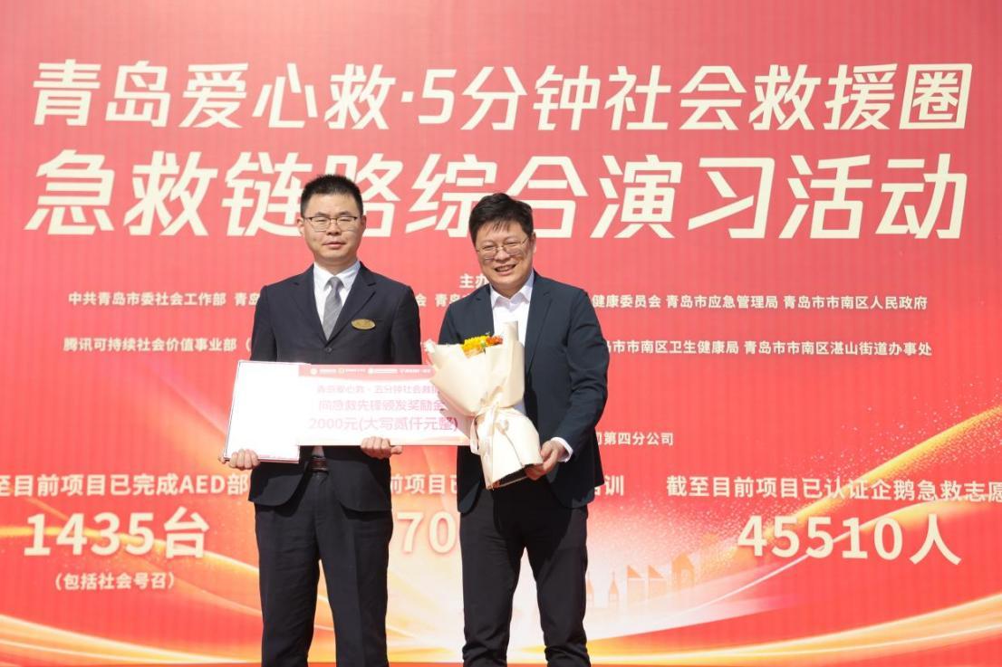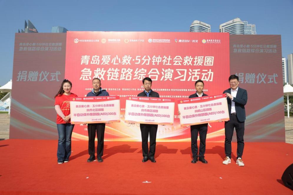 慈明慈善基金会现场向市南区、市北区、崂山区共计捐赠700台AED设备,助力5分钟社会救援圈建设。目前青岛已有5万余名急救志愿者,作为社会救援力量的重要组成部分,包括来自湛山街道、延安三路邮政支局、青岛市文化和旅游志愿者协会、青岛华仁物业股份有限公司、中国石油大学(华东)青岛软件学院、计算机科学与技术学院等志愿者代表们现场宣誓承诺“人人能救、人人会救、人人敢救”,争做急救先锋,在关键时刻竭尽全力救死扶伤。为弘扬见义勇为精神,腾讯SSV时光实验室副总经理胡晗翰向青岛海景花园大酒店急救先锋团队颁发证书和奖金。奖励项目启动以来首例利用新增AED成功挽救心脏骤停患者的英勇事迹。