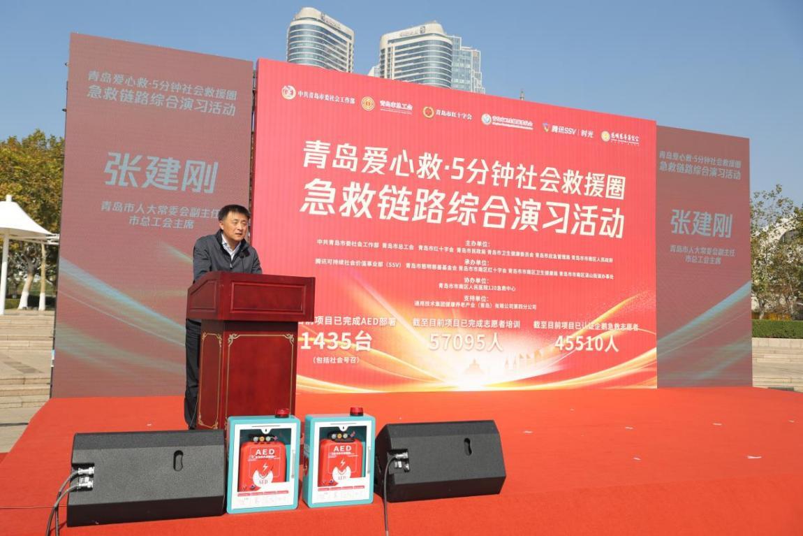 青岛市人大常委会副主任、市总工会主席张建刚宣布演习启动。通过现场模拟真实场景,展示了市民、志愿者、腾讯急救平台与120系统有效联动、五分钟快速响应的施救全过程,反映出5分钟社会救援圈急救链路的高效性与可行性。
