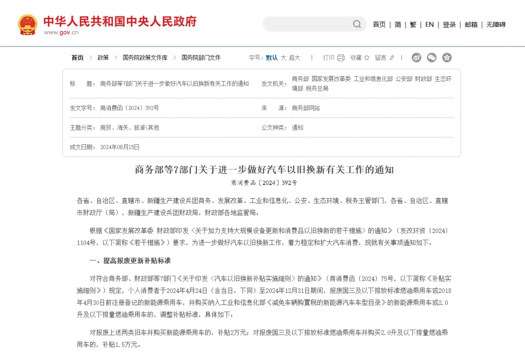 个人消费者于2024年4月24日(含当日,下同)至2024年12月31日期间,报废国三及以下排放标准燃油乘用车或2018年4月30日前注册登记的新能源乘用车,并购买纳入工业和信息化部《减免车辆购置税的新能源汽车车型目录》的新能源乘用车或2.0升及以下排量燃油乘用车的,调整补贴标准,具体如下: