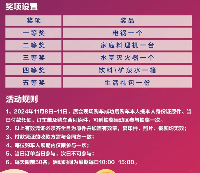 此外,组委会也特别设置了购车抽奖环节,现场每日前50名购车观众可参与抽奖一次,百分百中奖!