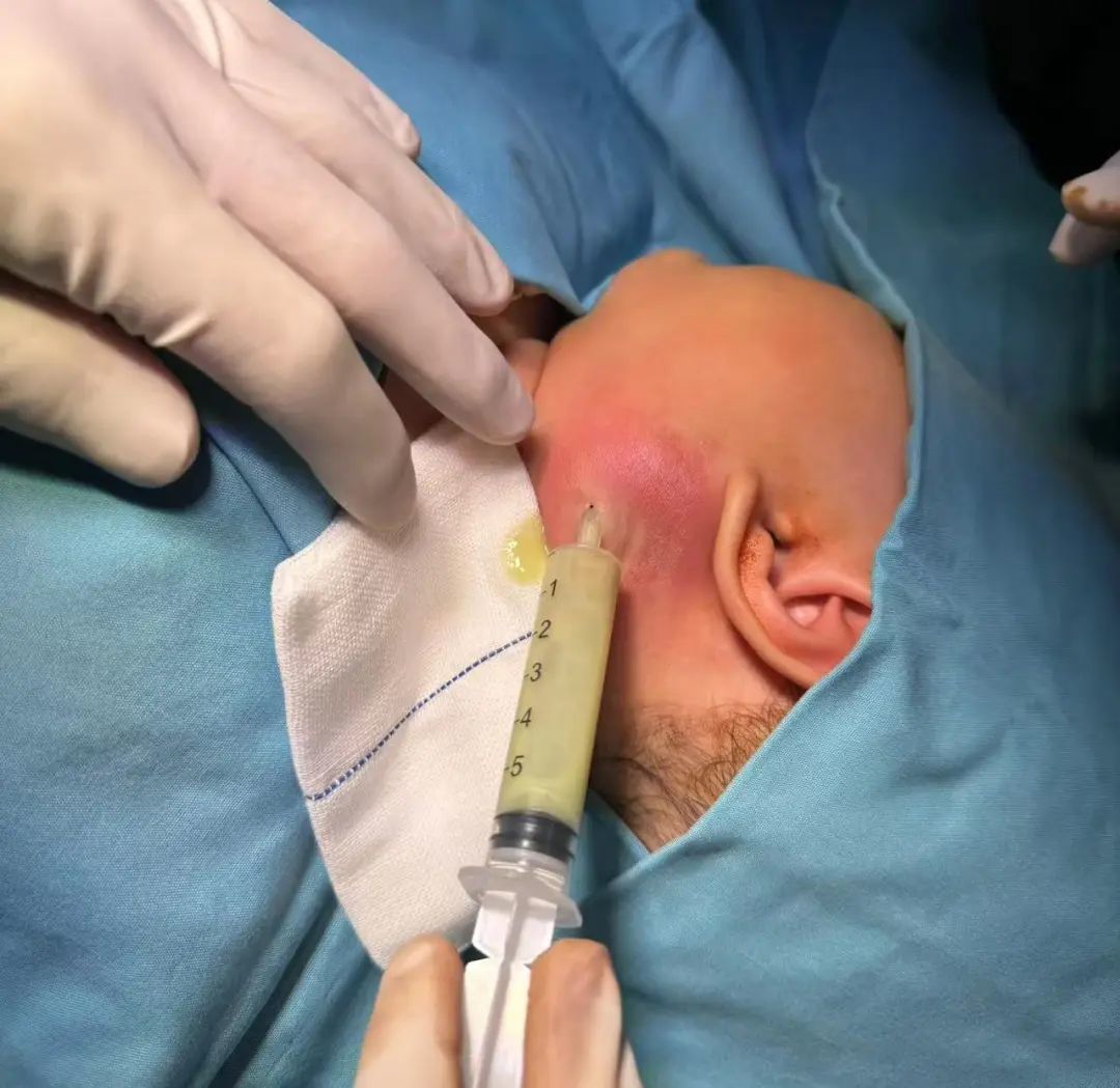 口腔颌面外科医生查体发现,锐锐左面部局部皮肤红肿,触碰时患儿哭闹的厉害。B超检查提示肿物内有液化,白细胞检验结果超出正常值5倍以上!结合检验检查,医生诊断锐锐为颌面部间隙感染,需要尽快手术切开引流!