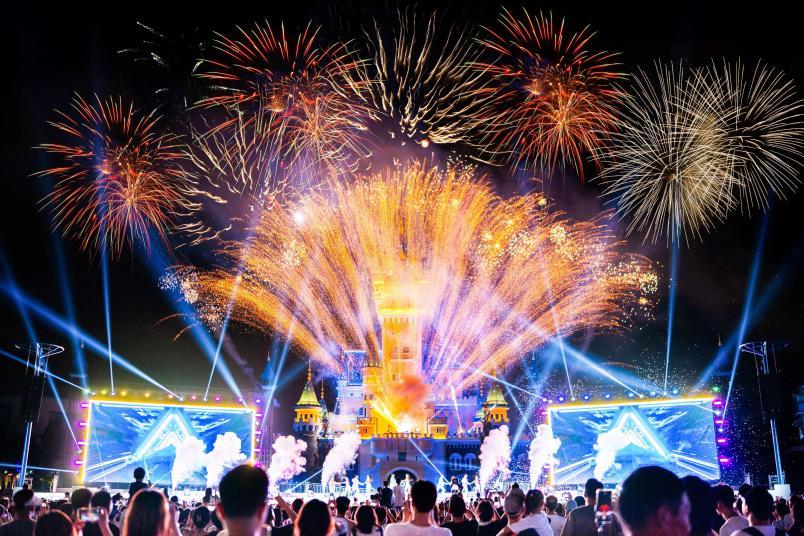 零点倒计时与璀璨星河花火秀将跨年夜推向高潮。在划破夜空的音乐声中,在人声鼎沸的城堡前,临近零点时刻,万人齐声倒数,共同迎接新一年的到来。当大屏的倒计时归零,璀璨的烟花将绽放夜空,让我们一同许愿:愿我们的未来如烟花般灿烂盛大!