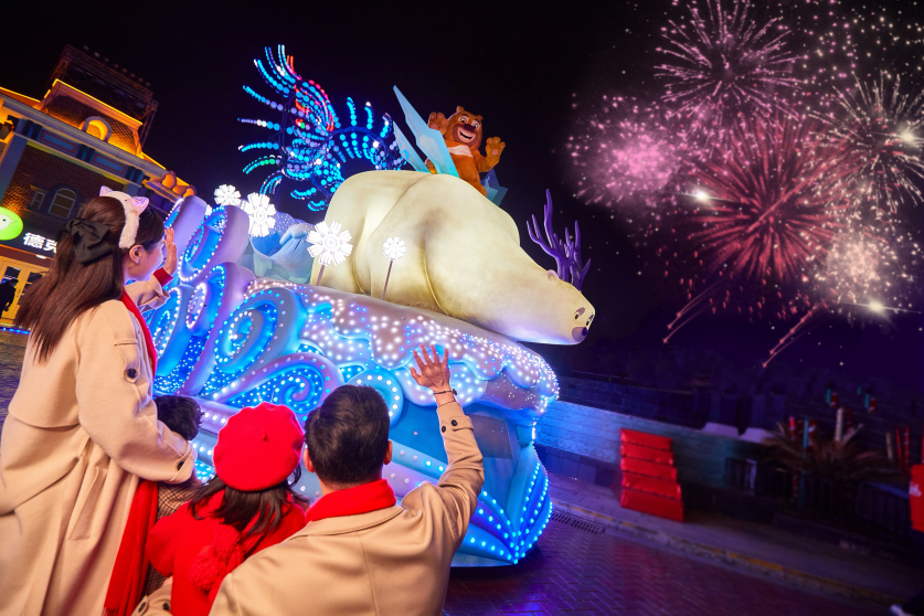 烟雾泡泡点缀雪光街道,营造出浓浓的飘雪氛围。活动期间,备受喜爱的熊熊花车将欢乐启航,俏皮的冰雪精灵和“熊出没”的大明星们与游客倾情互动。更有颜值NPC惊喜加入,与大家共同畅享冬日梦幻之旅。