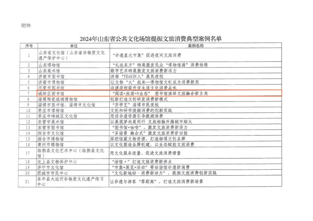 近日,省文化和旅游厅公布了全省公共文化场馆提振文旅消费典型案例,城阳区图书馆提报案例——《“阅读+旅游+N业态” 图书馆演绎文旅融合新主角》入选。