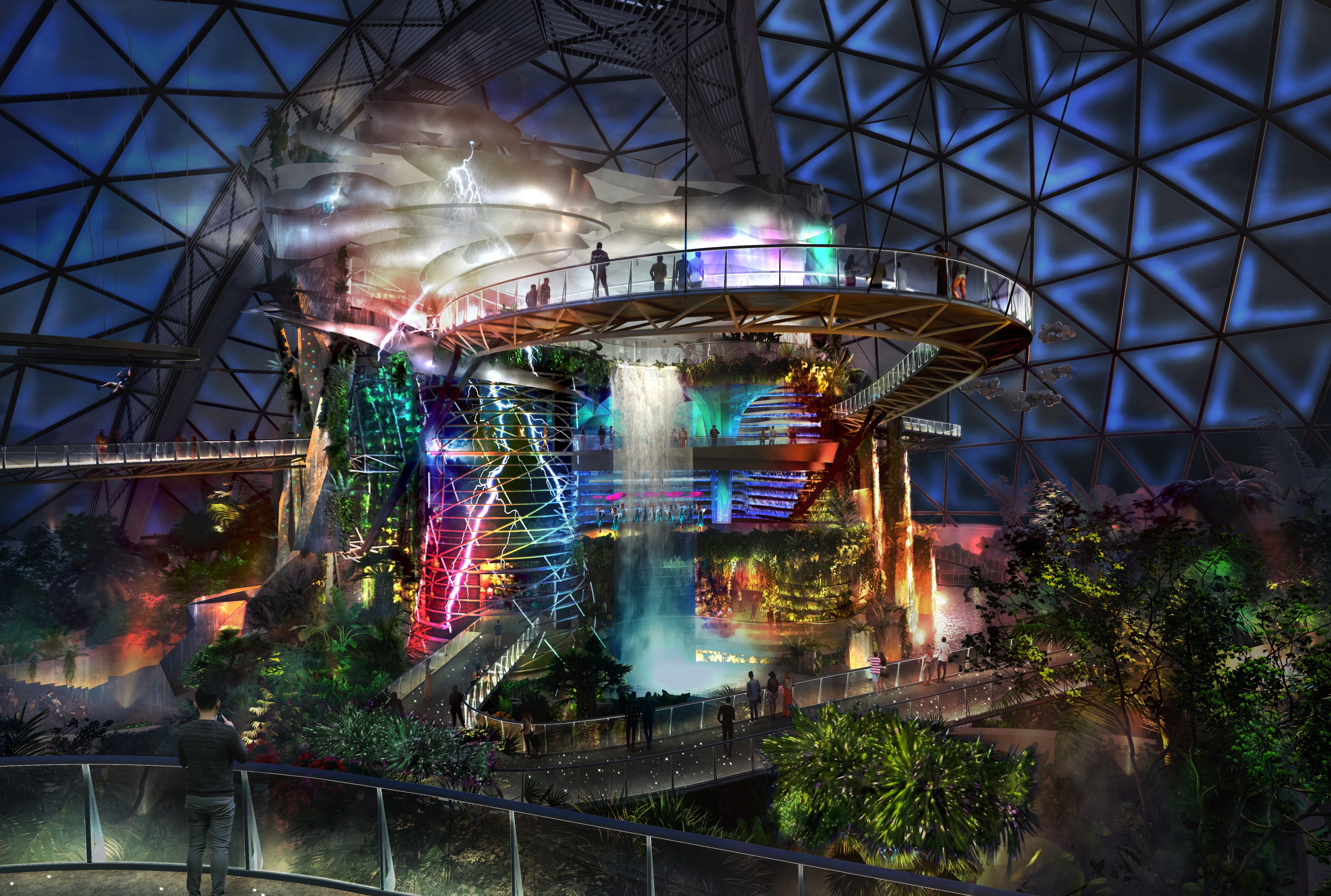 园区精心规划了五大主题区域,涵盖四大主题场馆、一大戏水乐园、一场花车巡游、一场夜·湖秀及五大互动游乐设施设备,集合了水孕育、水欢乐、水文明、水回馈等主题生态。近20处互动体验项目通过高科技、多媒体、沉浸式等技术,展示水实验、水循环、水生态、水保护、水生生物及气候模拟等内容,让游客在游玩中全方位、立体式感受并了解水的知识、形态及变化。此外,游客每天还能欣赏到近百场全天候特色演艺,充分融合中西方元素,带来视觉与互动的双重震撼。