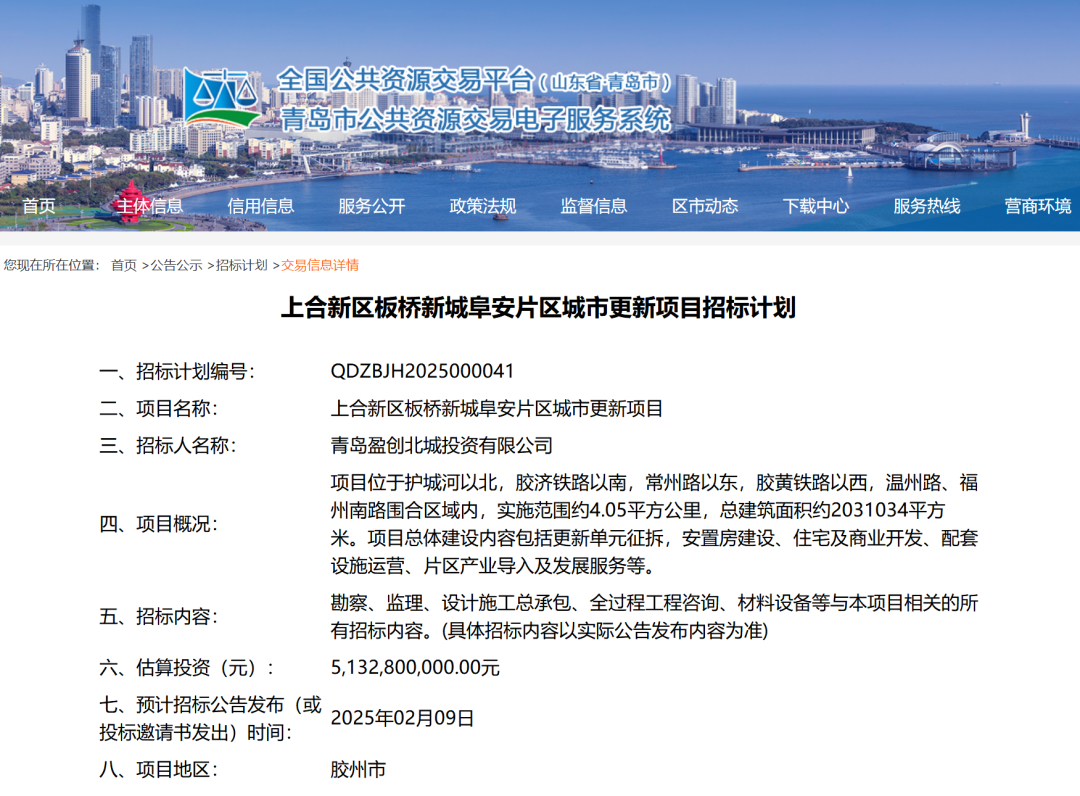 1月9日,青岛市公共资源交易电子服务系统发布“上合新区板桥新城阜安片区城市更新项目招标计划”。公告显示,项目估算投资达51.328亿元,建设内容包括更新单元征拆,安置房建设、住宅及商业开发、配套设施运营、片区产业导入及发展服务等。