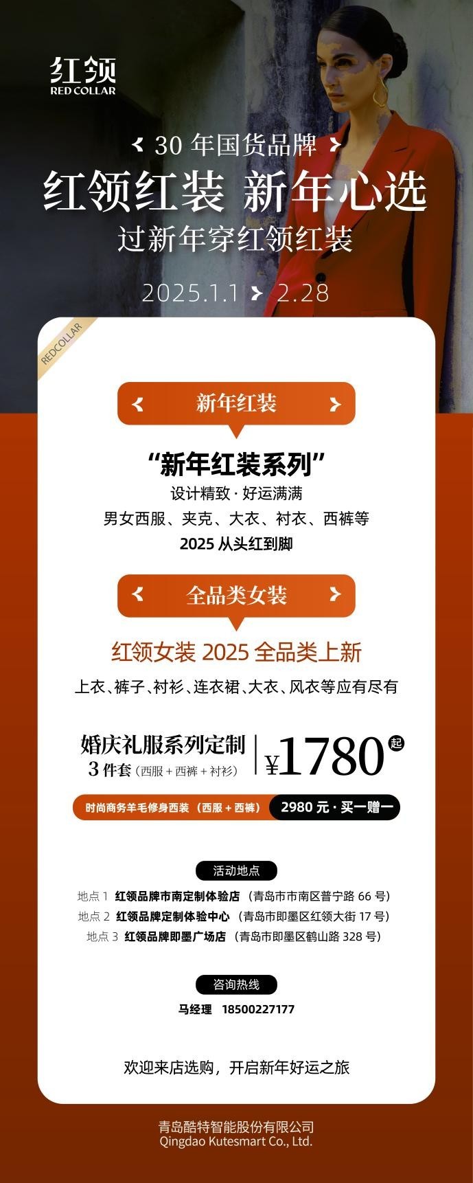 2025新年春节的脚步越来越近,在这辞旧迎新的美好时刻,红领品牌集传统与现代之美,为广大青岛市民倾情呈现一场【红领红装展】!