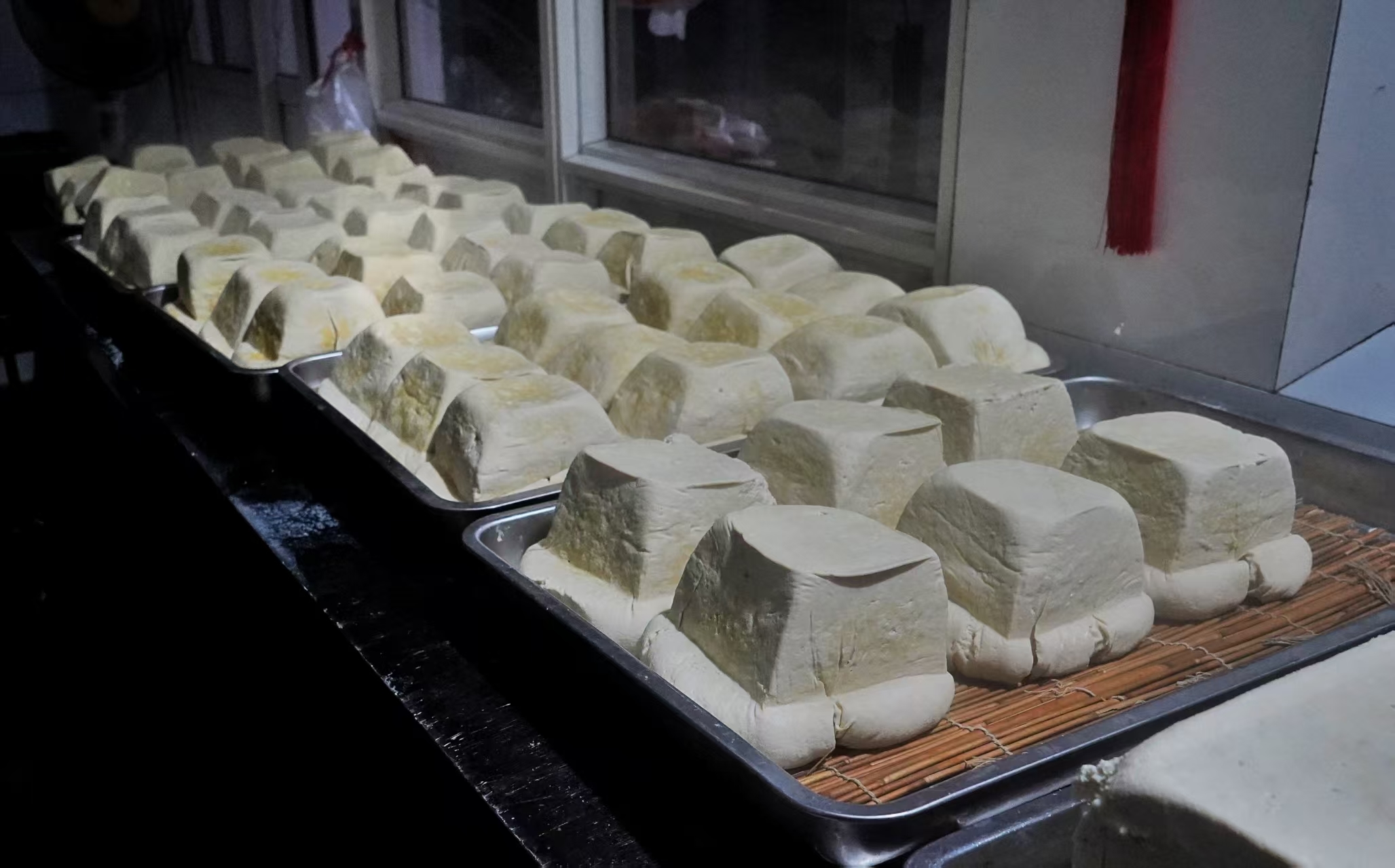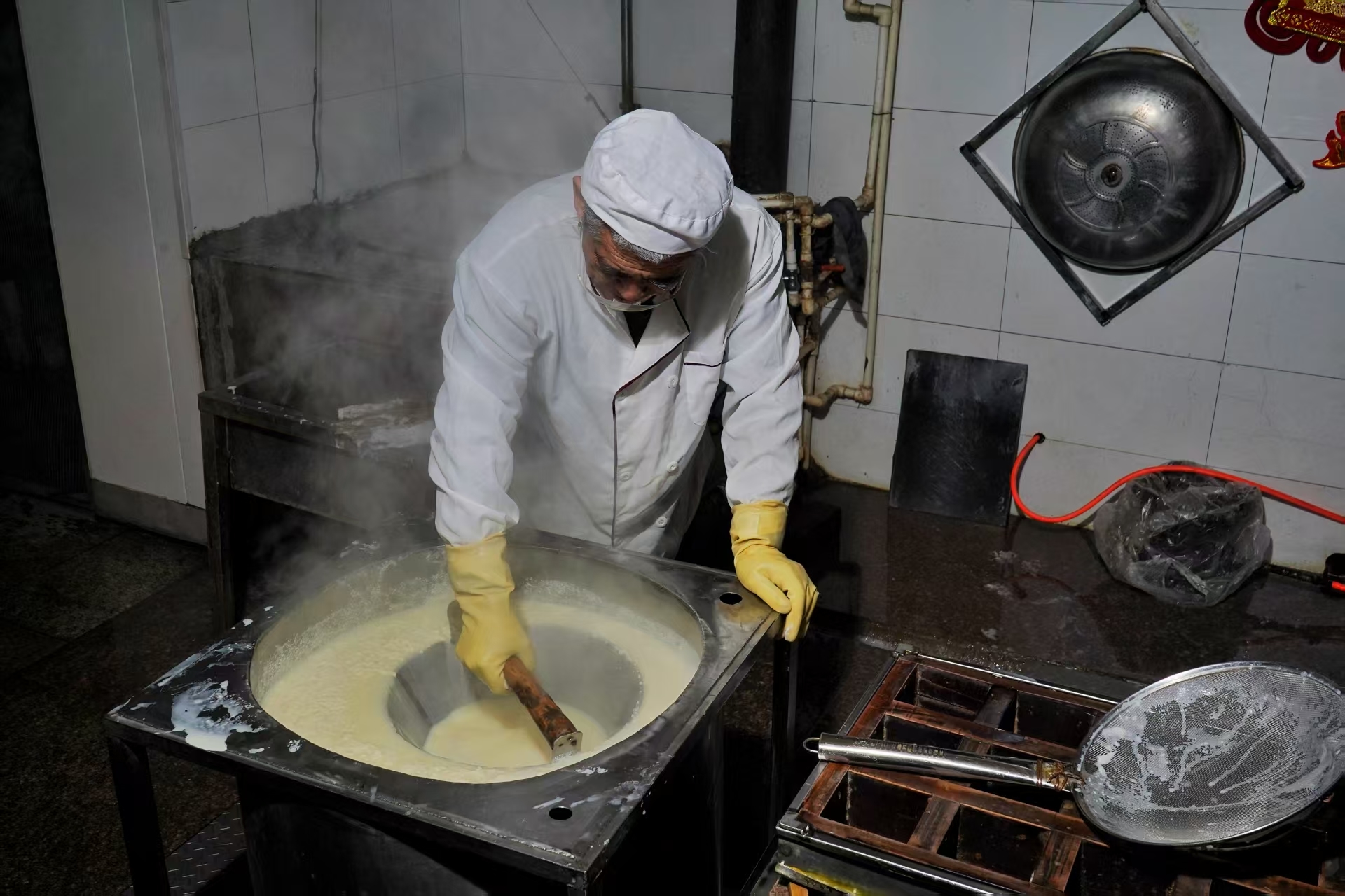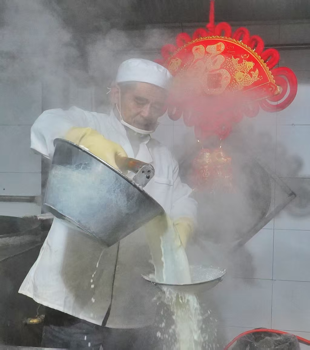 城阳胡氏卤水豆腐制作工艺承载着几代人的匠心与记忆,其制作流程包括选料、水洗浸泡、磨浆、压浆、入锅熬浆、出锅点卤水、注模成型、阴凉等8道工序,每一步都饱含着传承人的心血。点卤水是制作豆腐很关键的一道工序,其搅拌的速度和卤水的用量,完全靠手感、眼力、经验来掌握。春节前夕,第五代传承人胡孝金和妻子比往日更加忙碌,胡师傅夫妇在凌晨便已起身,投身劳作。万籁俱寂,城市还沉浸在酣眠之中,豆腐坊内却已灯火通明。泡好的豆子被送入石磨,随着石磨缓缓转动,洁白的豆浆汩汩流出,那细腻的质感和浓郁的豆香,瞬间弥漫在整个工坊。煮浆的炉灶火光熊熊,映照着师傅们专注的面庞,煮浆的过程更是关键,师傅们目不转睛地盯着火候,让豆浆在恰到好处的温度中翻滚,散发出诱人的香气。点卤环节如同一场神奇的魔法,豆浆在卤汁的催化下逐渐凝固,形成嫩滑的豆花,这是胡氏豆腐独特风味的关键所在。在这新春的暗夜与黎明之交,胡氏豆腐坊的师傅们以勤劳与匠心,赶制出饱含年味的豆腐,为即将到来的年集,准备着那份独特的美味与温暖。