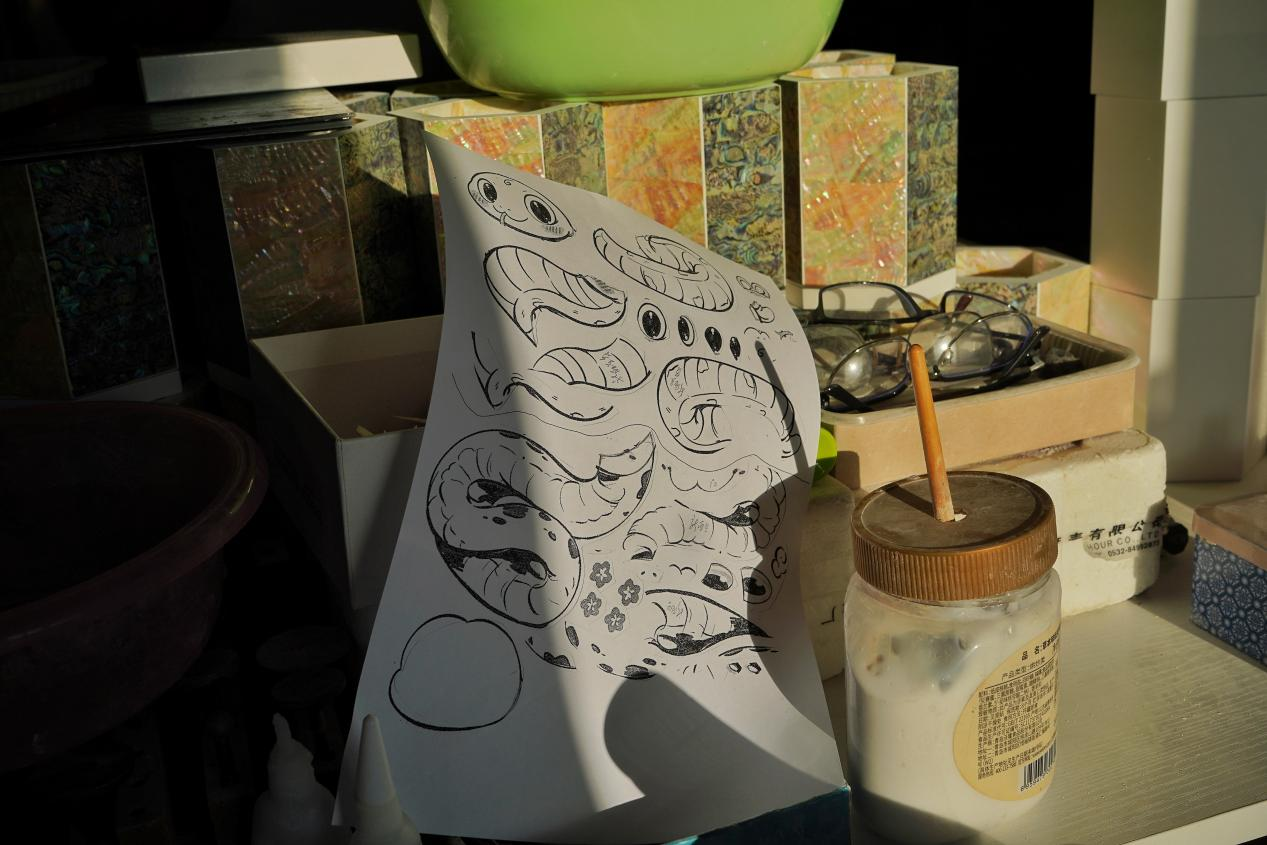 在拼接组装时,艺人们使用特制的胶水,将各个贝壳部件精准地黏合在一起,确保每一处衔接都自然流畅。最后,为了让整件作品更加生动,艺人们还会用彩色颜料为卡通蛇的眼睛、舌头等部位上色,使其色彩更加鲜艳夺目。