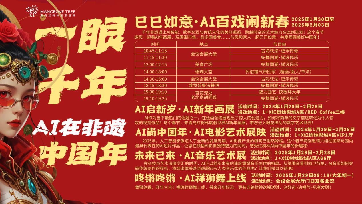 随着2025年蛇年春节的喜庆氛围弥漫开来,全国文旅市场呈现出一片火爆的繁荣景象。人们纷纷走出家门,以旅游的方式开启新年,使得各地的旅游景点迎来了大批游客,旅游、休闲娱乐的需求空前高涨。在这股旅游热潮中,国家级夜间文化和旅游消费集聚区、中国北方一站式滨海休闲度假胜地—青岛红树林度假世界在春节假期期间举办的“一眼千年・AI 在非遗中国年”活动,通过将 AI 技术与传统文化深度融合,为文旅产业的创新发展开辟了新的路径,让传统文化在新时代焕发出新的生机与活力,成为了众多游客心仪的热门打卡地。