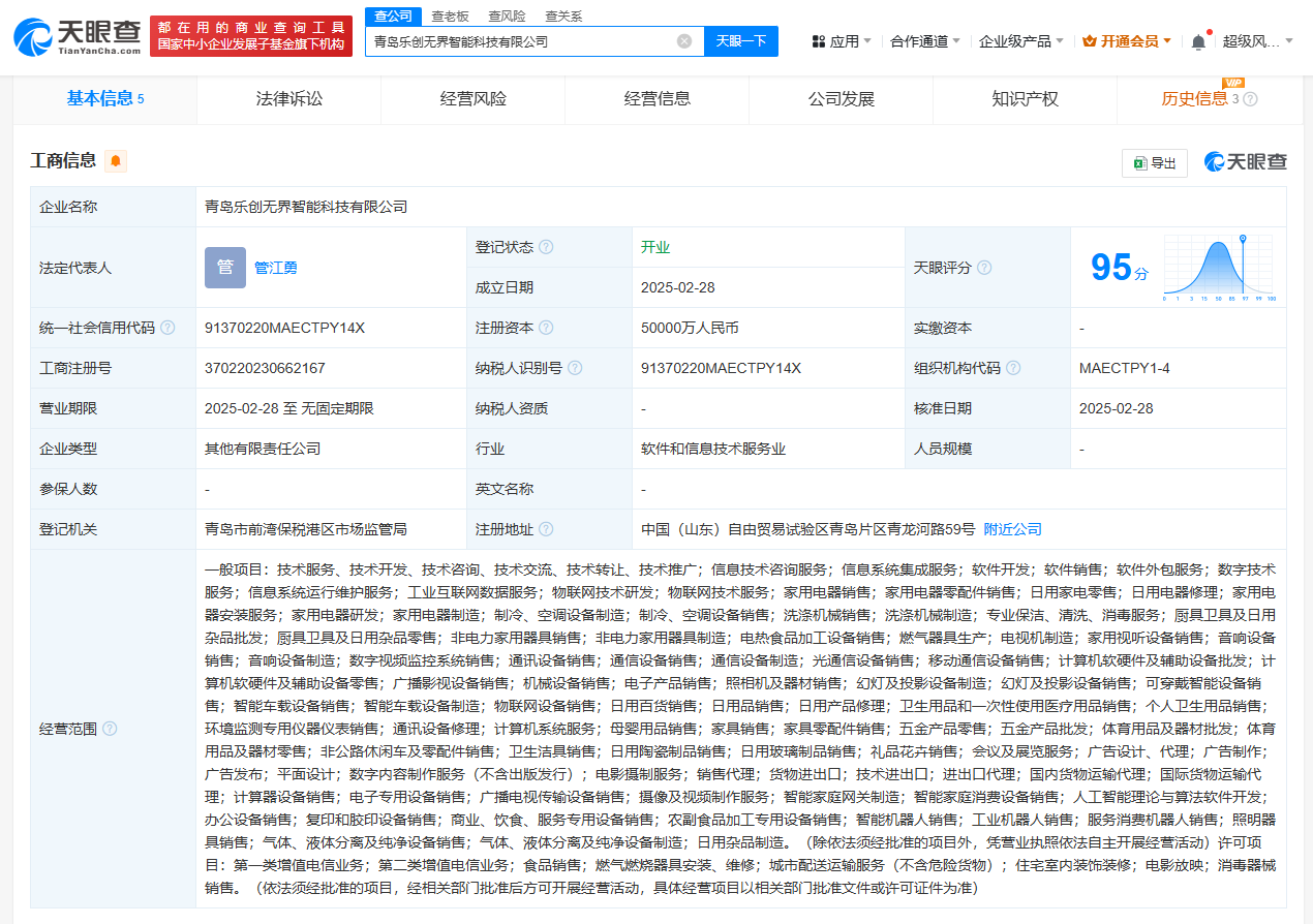天眼查App显示,近日,青岛乐创无界智能科技有限公司成立,法定代表人为管江勇,注册资本5亿元人民币。