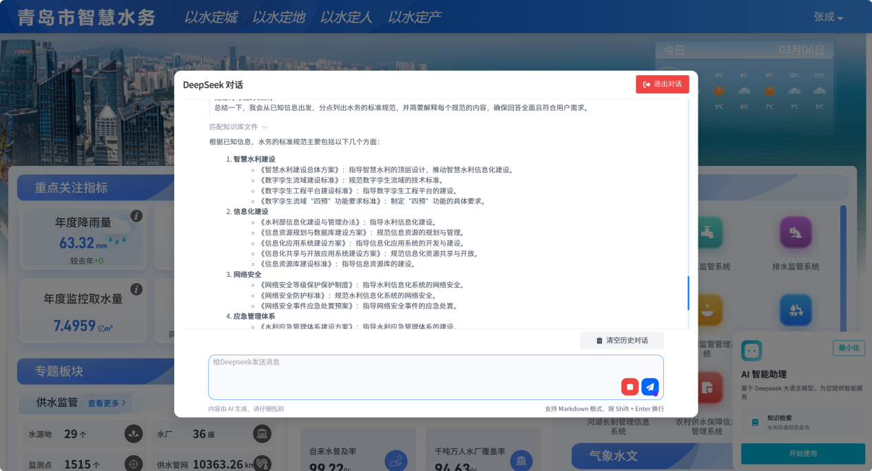 青岛市积极打造智慧水务业务应用体系,持续通过“AI+水务”提升现代化水网数智化水平。近日,青岛市水务管理局实现DeepSeek-R1模型在智慧水务平台辅助AI应用,通过业务与模型的深度融合,全面提升水务管理智能化水平。