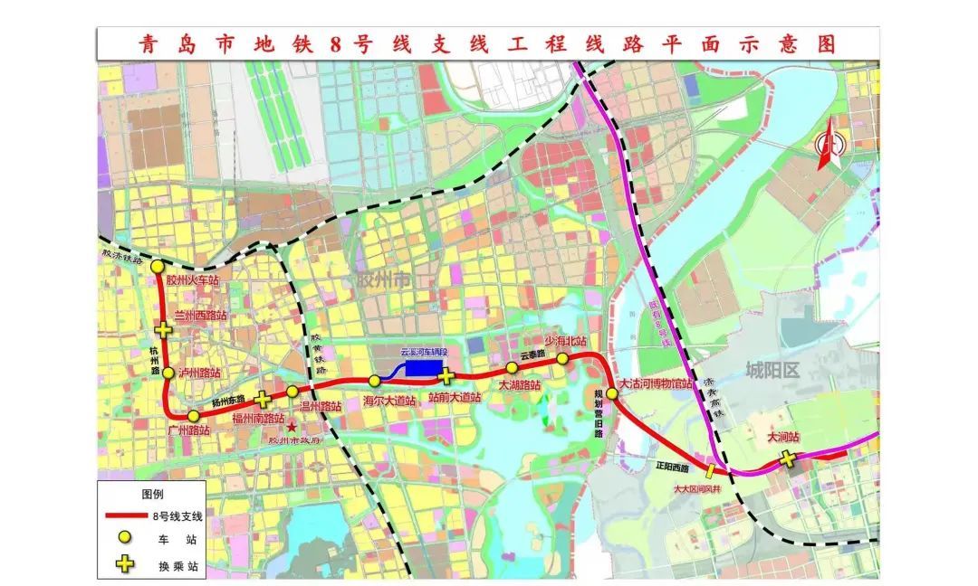 青岛地铁8号线支线是连接胶州和青岛市区的轨道交通线路,途经城阳区、胶州市,均为地下线。线路起于大涧站,止于胶州火车站,将与运营中的8号线北段贯通,将胶州引入青岛市轨道交通网络。线路全长20.4公里,设站12座。其中,胶州段全长约15.8公里,设车站11座、车辆基地1座。