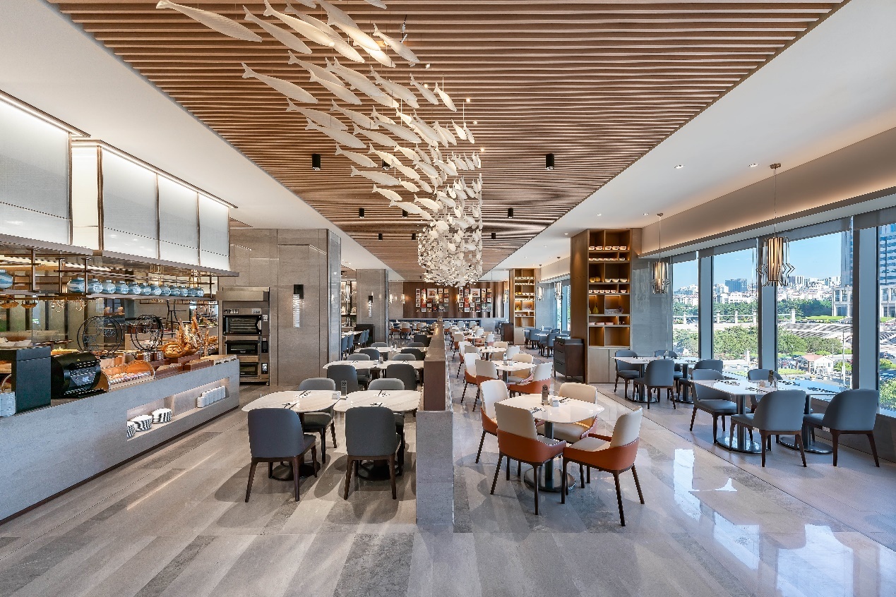 海风自助餐厅位于酒店的4层,面积约980平方米,可同时容纳193人就餐。时尚的挑高空间格局及巨大的落地玻璃景观窗,不仅可以鸟瞰静谧的环山盛景,也使得餐厅洒满了阳光,令人倍感舒适。全开放式的美食料理厨房,现场生动演绎经典的国际性自助美食及本地特色美馔,让宾客在坐拥山海之间,感受全新体验互动式的餐饮享受。