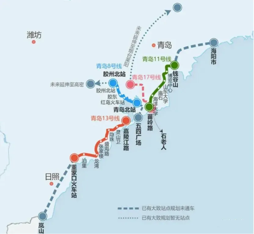 但有一点需要指出的是,公开报道显示,该线路西起于蓝谷快线终点站鳌山湾站,途经青岛田横组团、海阳丁字湾亚沙文化旅游产业聚集区,沿滨海公路、海滨西路、济南路到达终点海阳站,线路长约53.3km,设站8座,其中海阳境内设站5座。