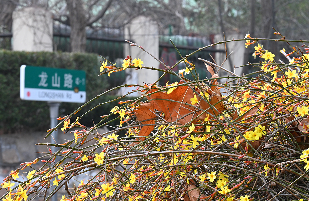 三月的青岛市南区,龙山路与龙江路上的迎春花花瀑倾泻而下。