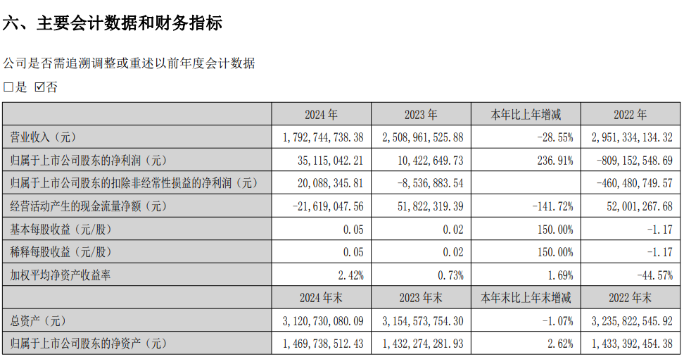 首先从年报来看,2024年青岛金王营业总收入为17.93亿元,同比下降28.55%。尽管营收下滑,但公司在2024年实现了归属净利润0.35亿元,同比增长236.91%;扣非净利润2008.83万元,同比增长335.31%。