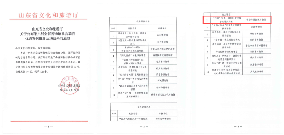 4月27日,由山东省文化和旅游厅组织开展的第六届全省博物馆社会教育优秀案例推介活动评选结果出炉。经专家委员会评选,城阳区博物馆“‘不其’而遇——城阳区馆校融合文博大课堂”获第六届全省博物馆社会教育优胜案例,是本次评选青岛市唯一获评的博物馆。