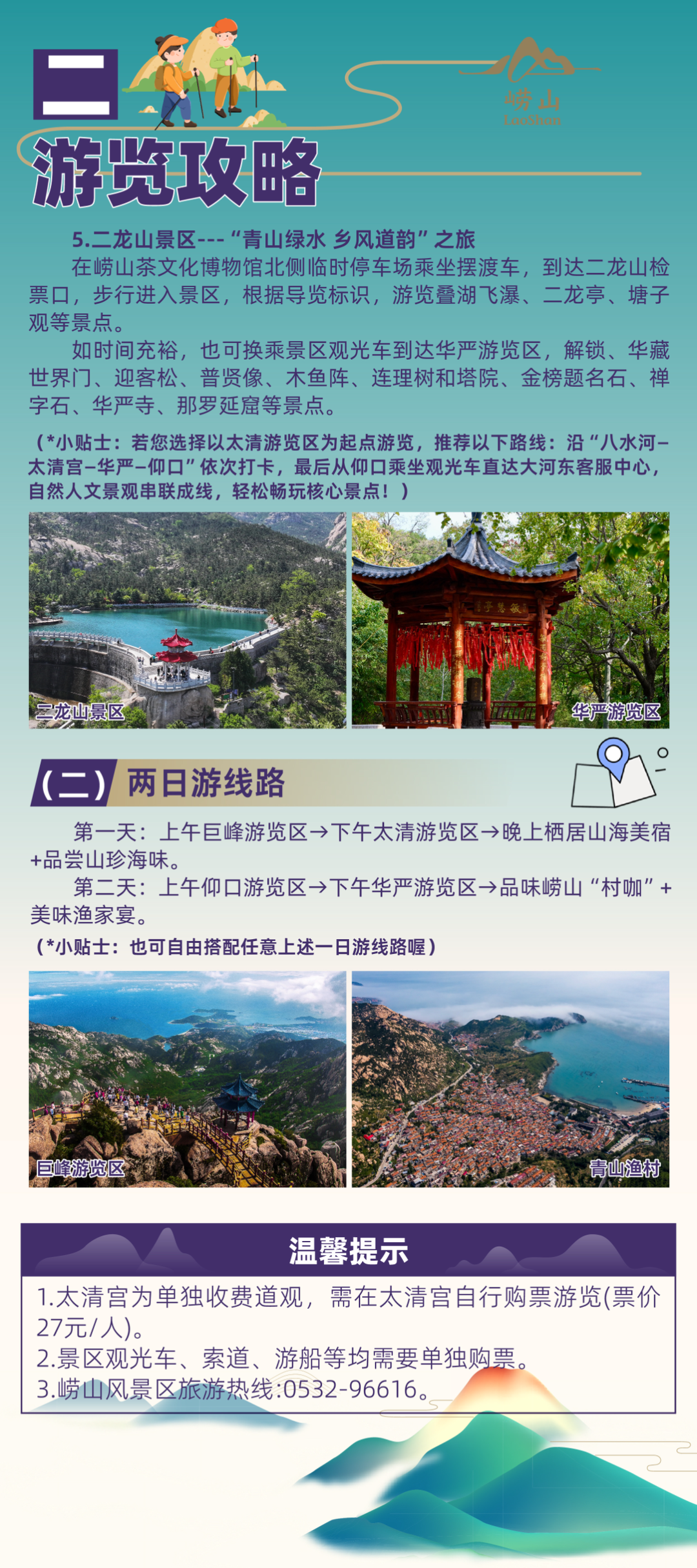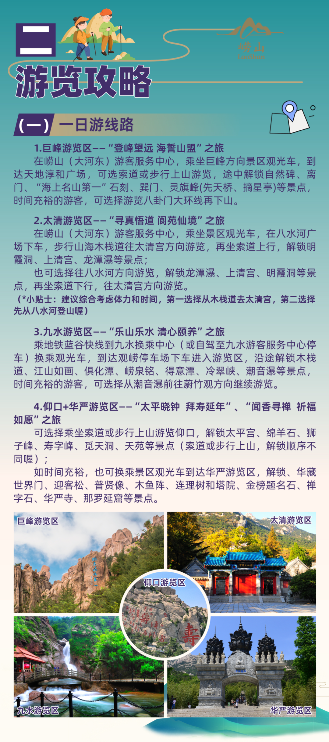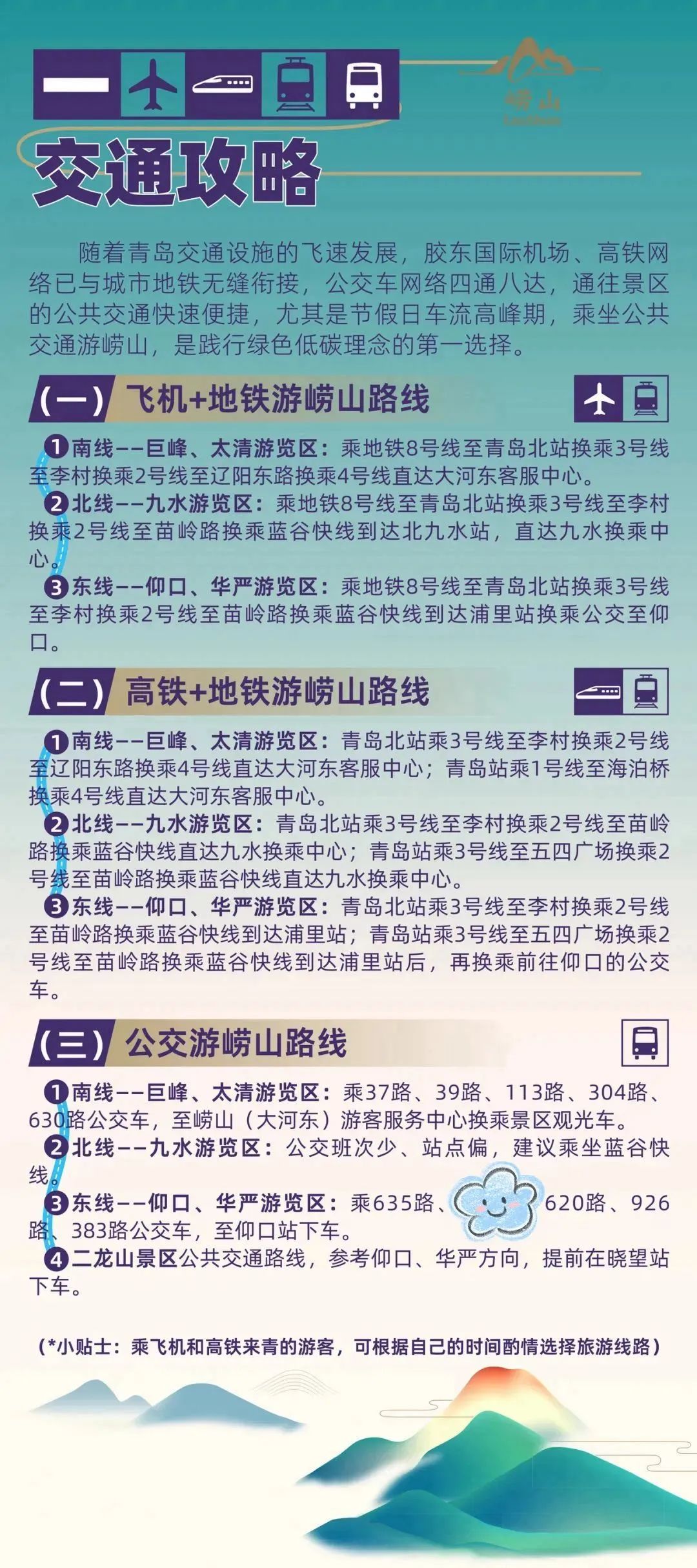 五一假期崂山景区迎来客流高峰,仰口方向车多缓行。建议您优先公共交通,低碳出行方式。或者前往太清、巨峰、九水景区游玩。