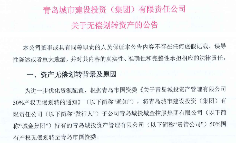 2025年4月24日,青岛城投集团发布公告,将其全资子公司城投城金持有的青岛城投资产管理有限公司50%国有产权无偿划转至青岛市国资委。