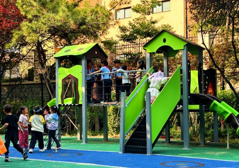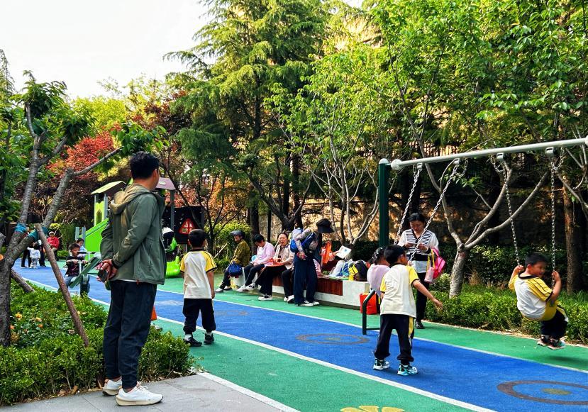 在城市的高楼与车流之间,孩子们需要一片自由奔跑、探索自然的地带。崂山区城市管理局充分利用崂山区银岭路东侧绿地空间,为孩子们打造了一片自由奔跑的天地,这里充满了欢声笑语,成为孩子们释放天性的乐园。色彩鲜艳的秋千、摇摇乐、跷跷板、滑梯组合等儿童游乐设施立体烘托,营造浓厚的儿童友好氛围;场地铺装采用柔软、耐磨的塑胶跑道,并进行彩绘喷涂,增加公园趣味性和安全性,孩子们在这里奔跑、攀爬、游玩、创造……在玩耍中锻炼了身体,增强了勇气,是家门口的“遛娃”好去处。