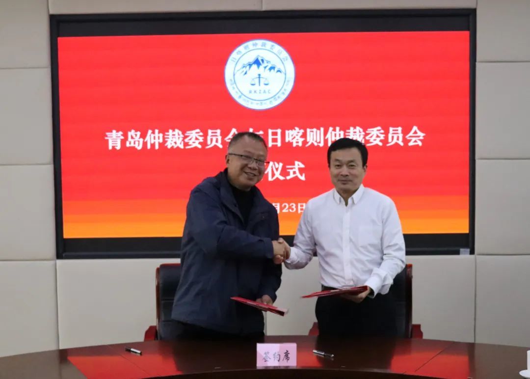 为全面落实中共中央办公厅、国务院办公厅《关于完善仲裁制度提高仲裁公信力的若干意见》,根据司法部统一部署,5月23日,青岛仲裁委员会一行赴日喀则仲裁委员会,双方共同签署《青岛仲裁委员会对口援助日喀则仲裁委员会协议书》,并围绕落地落实协议内容进行座谈交流。日喀则市政府副市长、日喀则仲裁委员会主任叶海涛,青岛仲裁办党组成员、副主任常江,日喀则市司法局党组书记、日喀则仲裁委员会副主任、办公室主任巴桑,日喀则仲裁委员会办公室副主任文永松、周理剑及双方相关工作人员参加座谈。