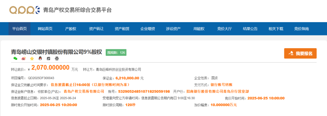 崂山财政局下辖青岛巨峰科技创业投资有限公司(以下简称“巨峰科创”)以2070万元底价挂牌转让青岛崂山交银村镇银行9%股权。