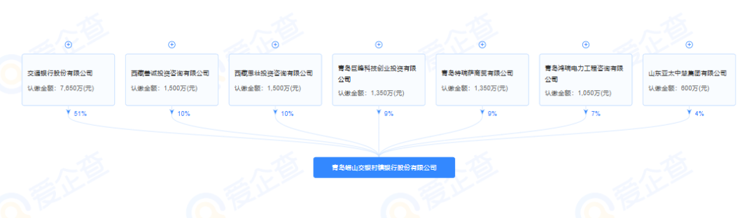 股权结构方面,崂山交银村镇银行的主发起人交通银行是其第一大股东,持股比例为51%。此外,西藏善诚投资咨询有限公司、西藏思壮投资咨询有限公司、青岛巨峰科技创业投资有限公司、青岛特瑞萨商贸有限公司、青岛鸿瑞电力工程咨询有限公司、山东亚太中慧集团有限公司分别持股10%、10%、9%、9%、7%和4%。