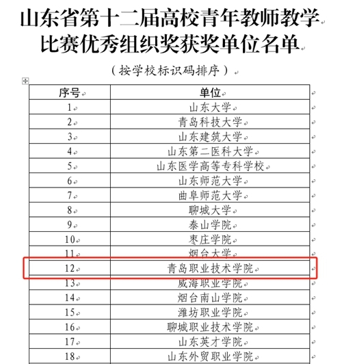 近日,山东省第十二届高校青年教师教学比赛决赛在山东大学举行。青岛职业技术学院海尔学院教师王晖凭借扎实的教学功底,从众多参赛选手中脱颖而出,荣获一等奖,马克思主义学院教师孟庆荣荣获优秀奖,学校荣获优秀组织奖。