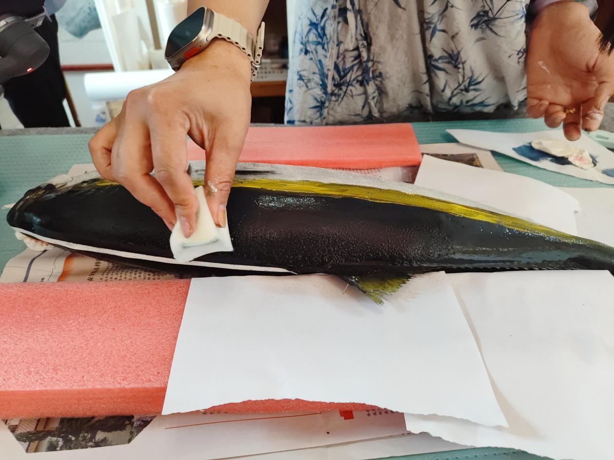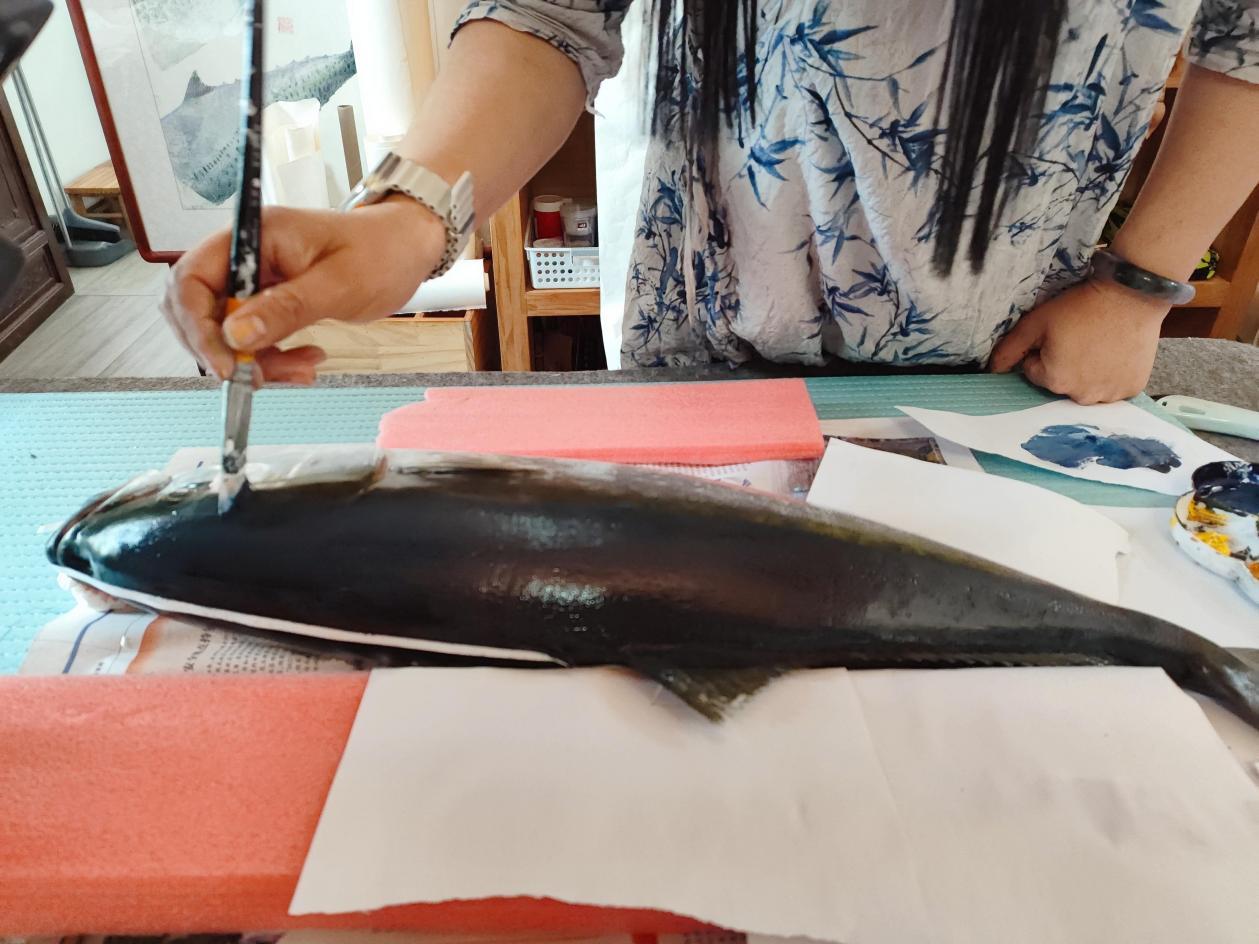 在王炳娜的工作室里,我们见证了鱼拓制作的每一个细节。从拓印的精准到调色的细腻,再到点睛的传神,每一步都凝聚着匠人的智慧与汗水。她告诉我们,鱼拓的制作不仅需要精湛的技艺,更需要对色彩、形态乃至生命力的深刻理解。