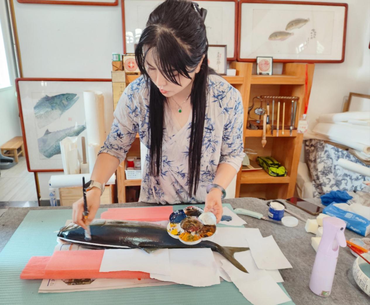在王炳娜的讲述中,鱼拓艺术的历史长河缓缓展开。这门技艺,起于宋朝,原是文人墨客用以记录渔获、寄托闲情雅致的方式,后因战乱等原因流落至日本,并在那里得到了更为系统的传承与发展。而今,当王炳娜接过家族的接力棒,成为第三代传承人时,她不仅是在守护一项技艺,更是在守护一份对传统文化的尊重与热爱。