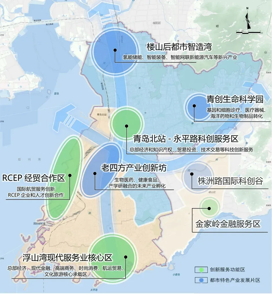 针对东岸城区产业布局,规划中提出要打造“一廊、一带、三区、三片”。其中,“三区”指创新服务功能区,包括浮山湾现代服务业核心区、青岛北站-永平路科创服务区、RCEP经贸合作区。