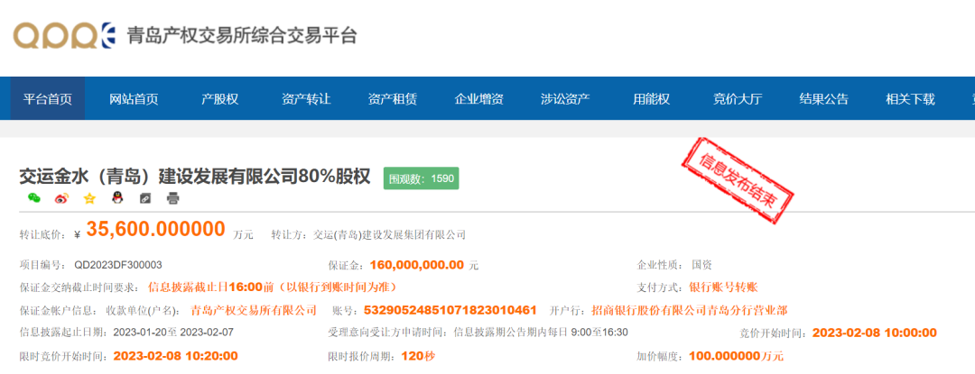 2023年2月,交运(青岛)建设发展集团有限公司迎来第三次挂牌转让。