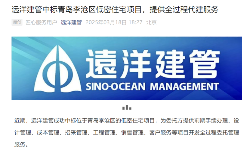 3月18日,远洋建管官微发布中标青岛李沧区低密住宅项目公告。