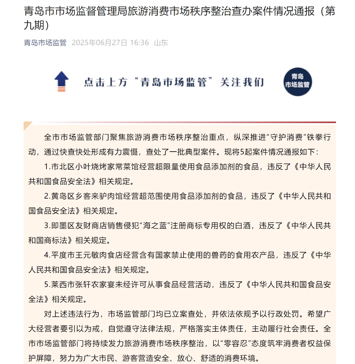 青岛市市场监管部门聚焦旅游消费市场秩序整治重点,纵深推进“守护消费”铁拳行动,通过快查快处形成有力震慑,查处了一批典型案件,6月27日,青岛市市场监管局通报5起案件情况: