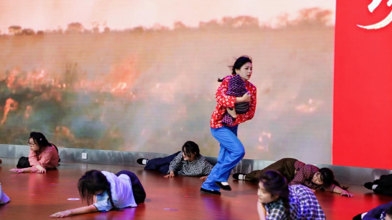 开场舞蹈《1937 活着》以血色浪漫的肢体语言,再现抗战时期军民鱼水情;诗朗诵《诗颂风华》用铿锵诗句串联起党史重大事件,致敬百年征程中的光辉时刻。