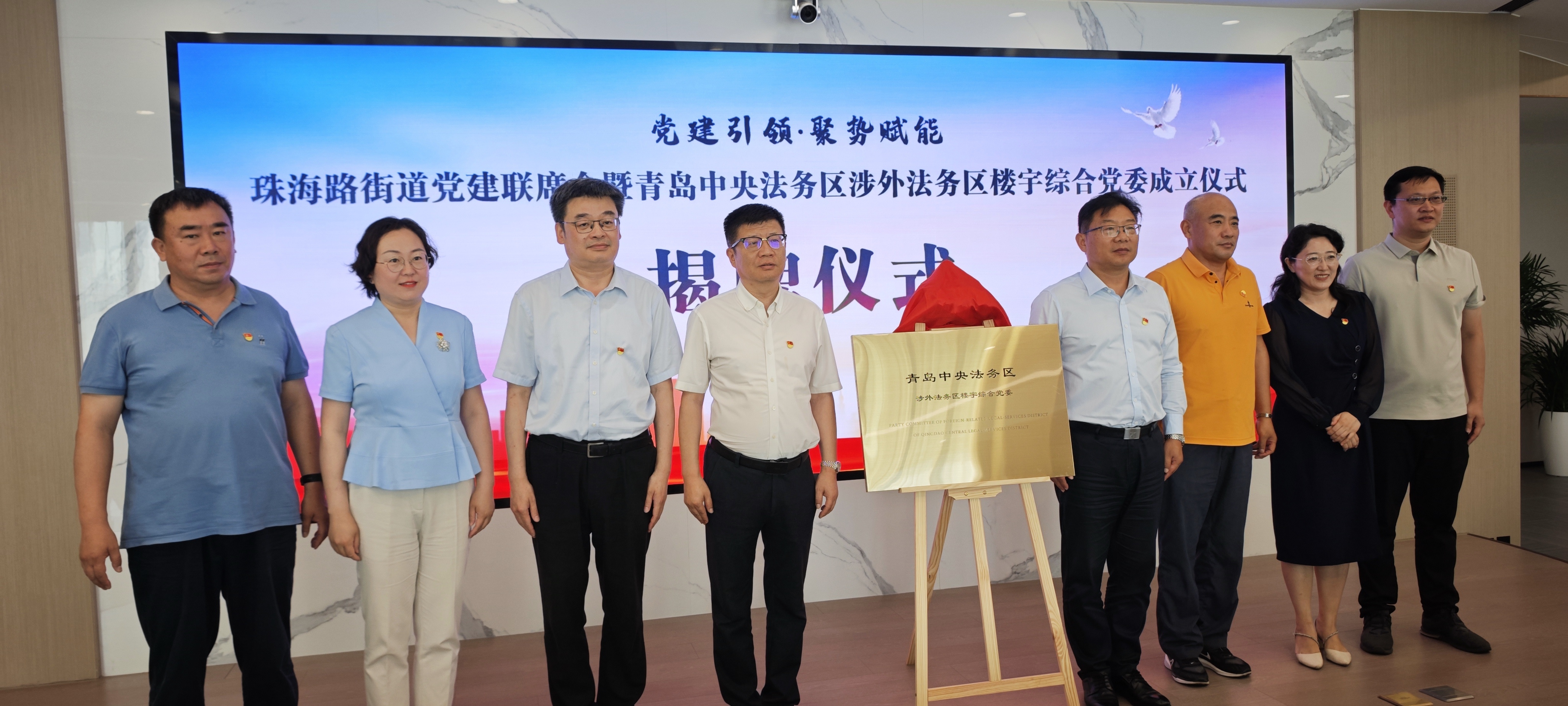 6月24日下午,珠海路街道党建联席会暨青岛中央法务区涉外法务区楼宇党委成立仪式现场,随着红色幕布缓缓揭开,一块写有“青岛中央法务区涉外法务区楼宇党委”的崭新牌匾正式亮相。