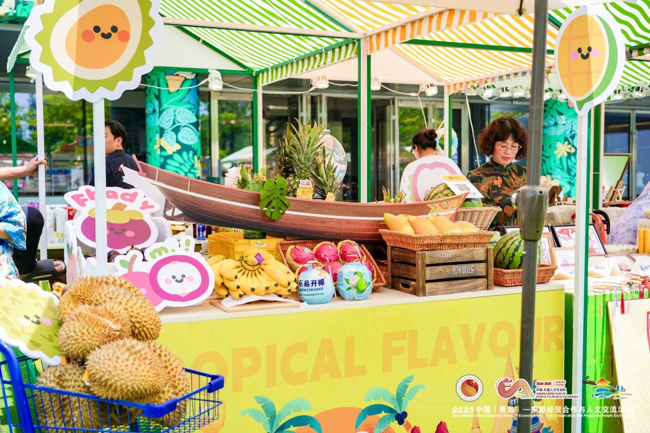 在青岛海天中心户外南广场,印象东盟·东南亚风情街人头攒动。热带香甜水果、异域特色服饰、中国传统非遗、青岛城市文创……21个展位别具匠心。在这里,热带风情与中国传统文化激情碰撞,吸引了往来市民和游客前来打卡。