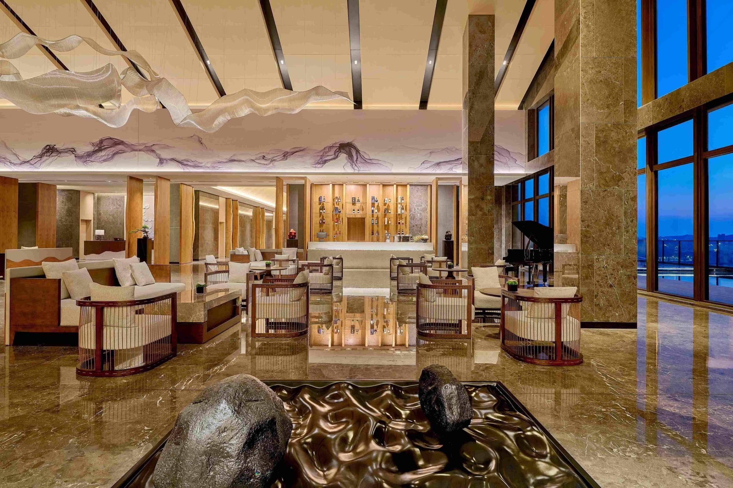 酒店建筑外形以岩石的坚硬轮廓为灵感,从外立面到庭院角落都采用了大量天然石材;大堂空间以天然岩纹为主题,点缀以海洋灵感的波纹线条,呼应青岛海岸线的壮丽风光。