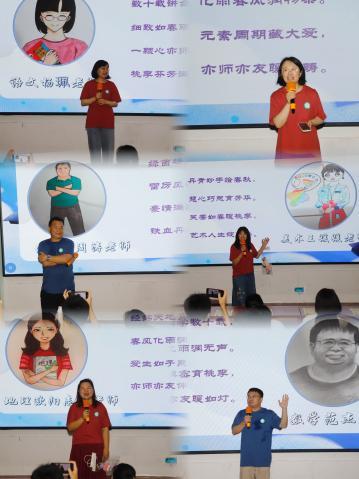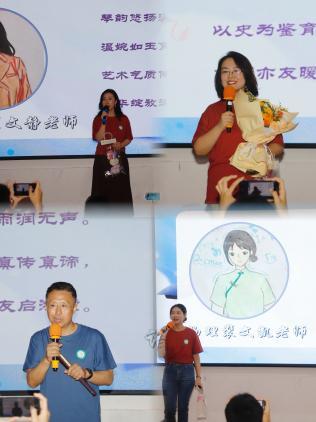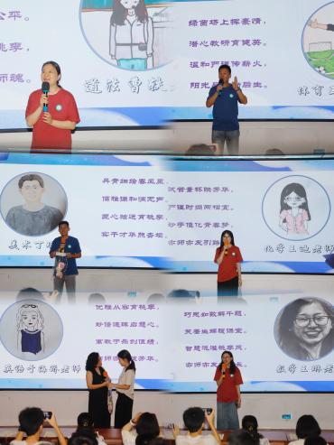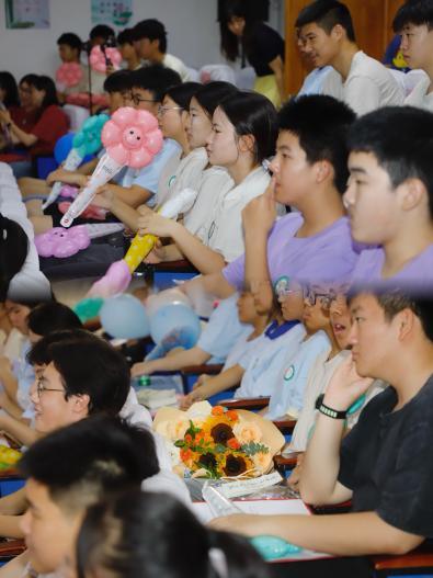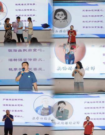 在第二篇章中,班主任老师们深情朗诵《此去繁花似锦,归来仍是少年》,他们用真挚的语言诉说着三年来的陪伴与期许,学生代表上台献花,表达对班主任们深深的敬意与感激。在“你画我猜”环节中,同学们拿起画笔,用心勾勒出老师们的神态特征,一幅幅生动有趣的画作跃然纸上,引得全场笑声连连、掌声不断。当大家猜出画中人后,老师们缓缓走上舞台,眼含笑意,深情地为同学们送上毕业祝福,字字句句温暖动人,令人久久难忘。同学们鞠躬致谢,感恩老师们三年来的辛勤培育与陪伴。师生双向奔赴,彼此眼中都闪烁着感动的泪光,浓浓师生情在此刻静静流淌,温暖了在场的每一个人。