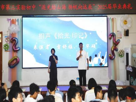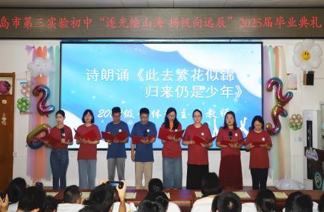 主持人运芃宇、刘欣媛、王英豪、周鸿雅用一首《总有美好在路上》表达了对所有毕业生的祝福。他们动情地说:“离别不是终点,而是新故事的起点。青春永不散场,我们的心永远相连。”在全体师生的掌声与祝福中,青岛市第三实验初中2025届毕业典礼圆满落幕。三年时光转瞬即逝,但青春的记忆将永远镌刻在每一位毕业生的心中。愿他们带着母校的祝福,逐光而行,绘出属于自己的山海,扬帆远航,奔赴星辰大海。
