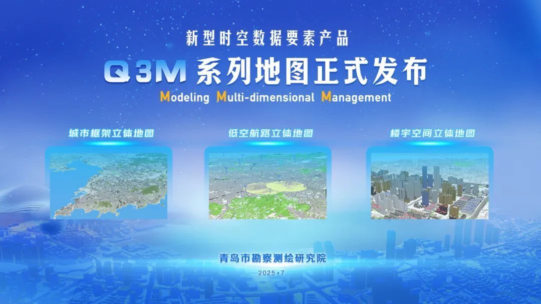 活动现场,青岛勘测院正式发布了自主研发的Q3M(QD 3D Map)系列地图产品,Q3M系列地图基于其三维模型核心数据库构建,具有“一库多能、按需组装、定制服务”三大特点,与Q3D时空信息平台形成协同支撑体系。