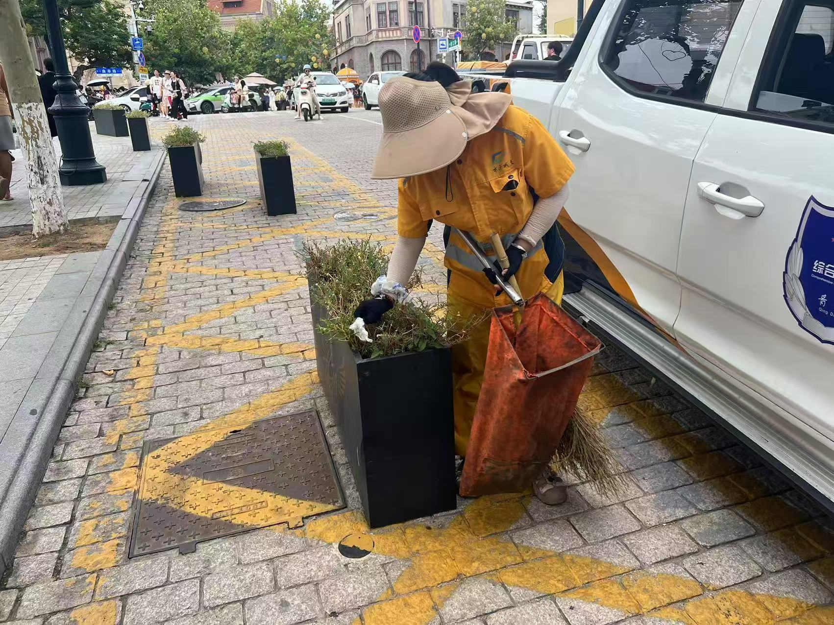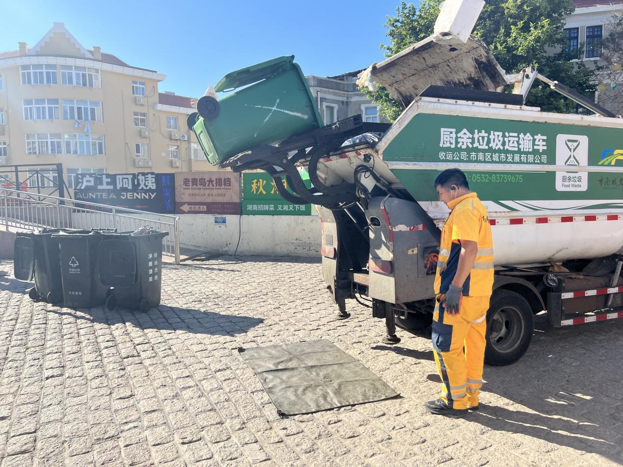 城市的洁净底色由环卫工人用心守护。据市南区城市发展有限公司工作人员介绍,在三江里、大鲍岛、海誓山盟广场等分会场及周边部署固定保洁与巡查人员,重点区域保洁延时至 21 时。面对庞大的人流量,通过跨站抽调机动人员充实力量,垃圾收运频次从每日 4-5 次增至 5-6 次,增设的临时垃圾桶有效减少落地垃圾。创新推出的 “定时定点、上门直收”清运模式,调配小型电动压缩车等设备直达商户门前,破解了大型车辆清运难题,让老城在热闹中始终保持清爽。
