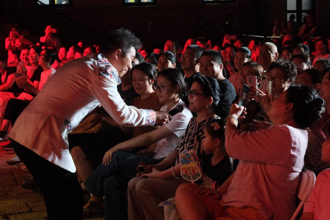 王宏伟热情邀请市民上台,共同唱响《草原上升起不落的太阳》,熟悉的旋律响起,台上台下齐声唱和,歌声在百年里院中回荡。