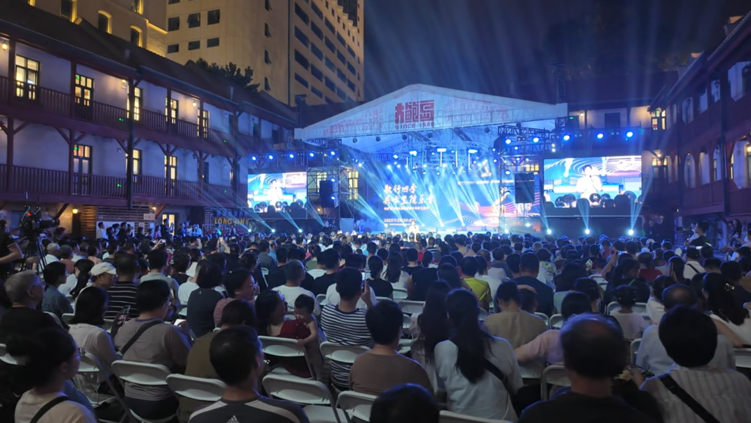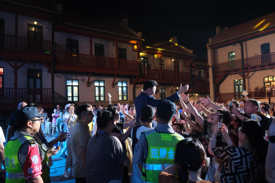 演唱间隙,他走到台下与观众“零距离”挥手互动,被层层观众围绕在舞台前,市民游客举着手机记录瞬间,沉浸在这场融合音乐与建筑艺术的盛宴中,欢呼声、歌声此起彼伏,将现场氛围推向高潮。