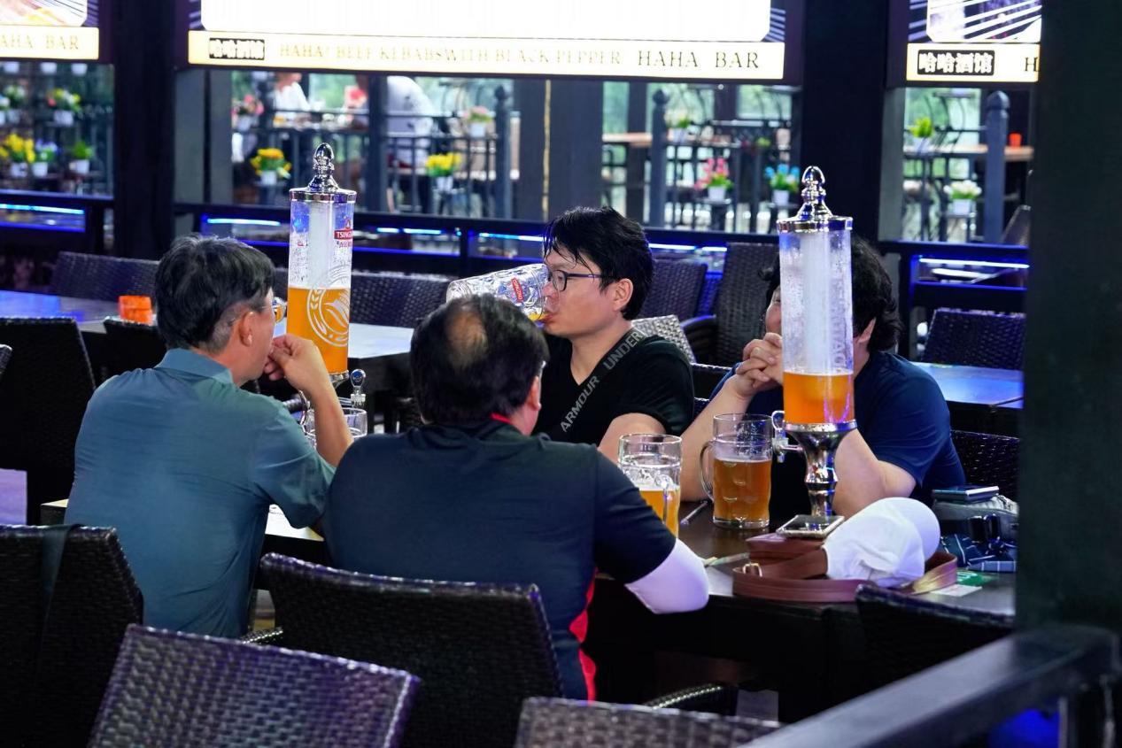 2021年的升级则彻底重塑了哈哈酒馆的模样。时尚前卫的工业风搭配暖黄射灯,将空间分成多个功能区,室外的用餐区适合家庭小聚;中央舞台区每晚有乐队驻唱,年轻人举着荧光棒随着节奏摇晃;啤酒吧台陈列着各种各样的啤酒,从原浆到黑啤,游客们可以随自己的喜爱挑选。