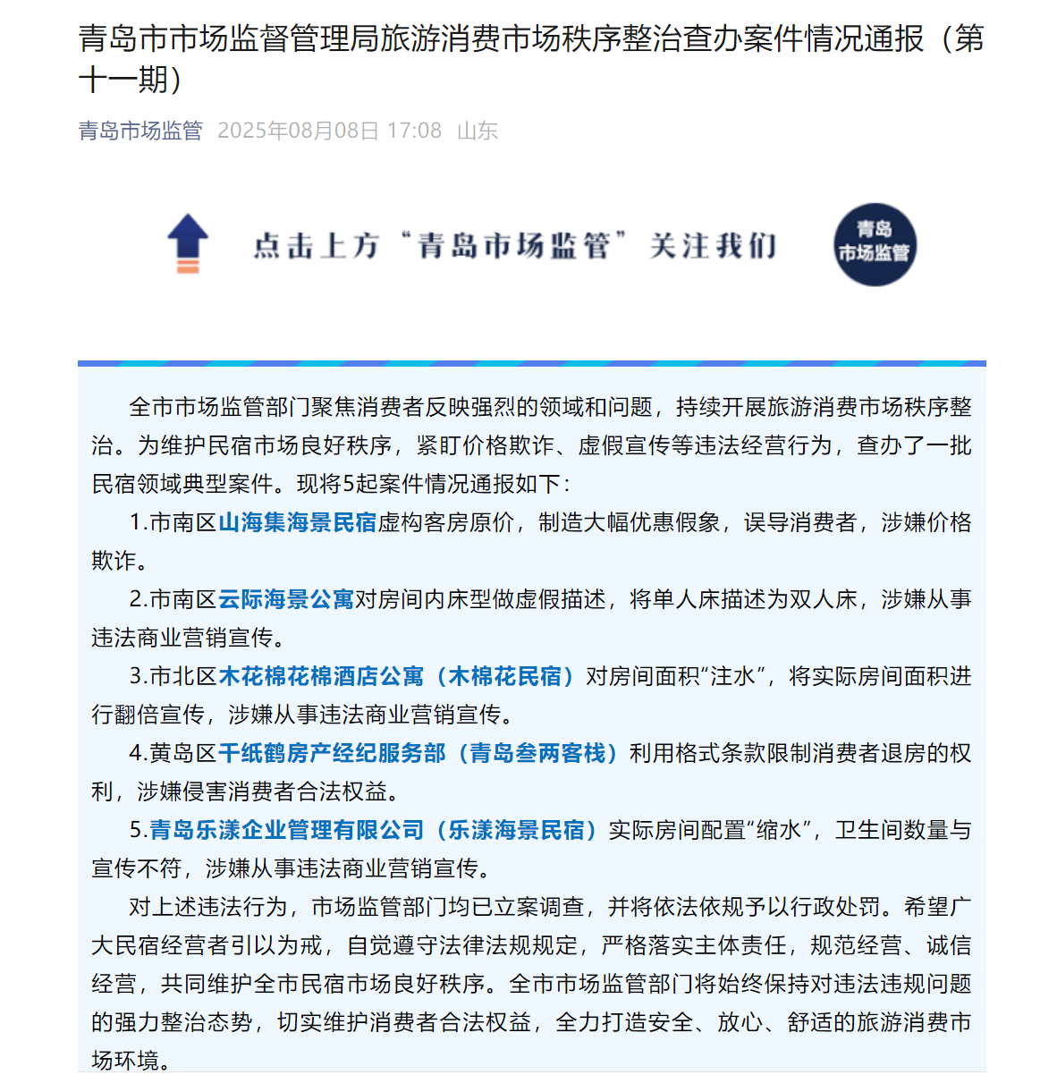近日,青岛市场监管部门聚焦消费者反映强烈的领域和问题,持续开展青岛旅游消费市场秩序整治。为维护民宿市场良好秩序,紧盯价格欺诈、虚假宣传等违法经营行为,查办了一批民宿领域典型案件。现将5起案件情况通报如下。