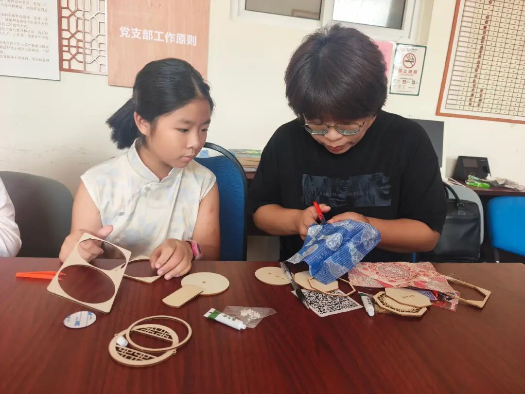 孩子们还利用宋锦织片和磁吸贴,制作出一个个精美的冰箱贴。缠枝纹、宝相花纹等传统纹样的织片,经过孩子们的巧手创作,化作了各具特色的艺术作品。